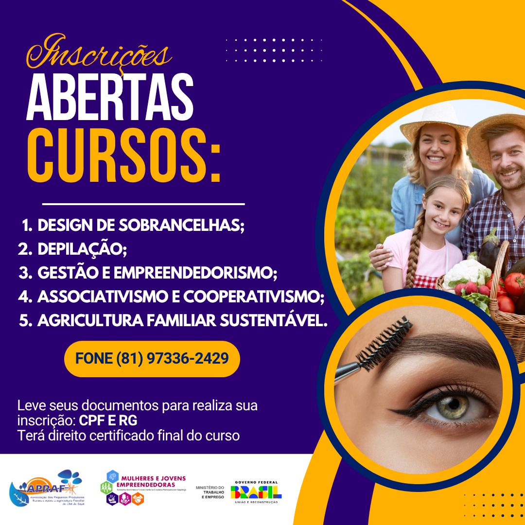 1. Agricultura Familiar Sustentável;2. Associativismo e Cooperativismo;3. Gestão e Empreendedorismo;4. Design de Sobrancelhas;5. Depilação. Observações: Levar documentos[…]